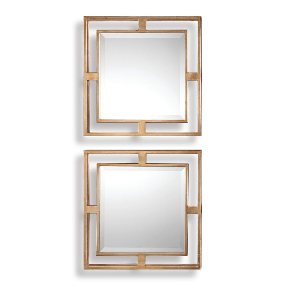 Forged iron featuring 3-dimensional depth, hand finished in a lightly antiqued gold leaf. Mirrors are beveled.