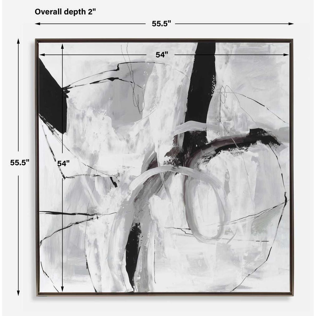 Giclee on canvas, this vast abstract features shades of warm tan, gray and cream highlighted with black accents. Surrounded by a simple gallery frame in a bronze gold finish, this piece may be hung horizontal or vertical. Each canvas is proudly handcrafted and printed in the USA. Artwork by PI Studio.