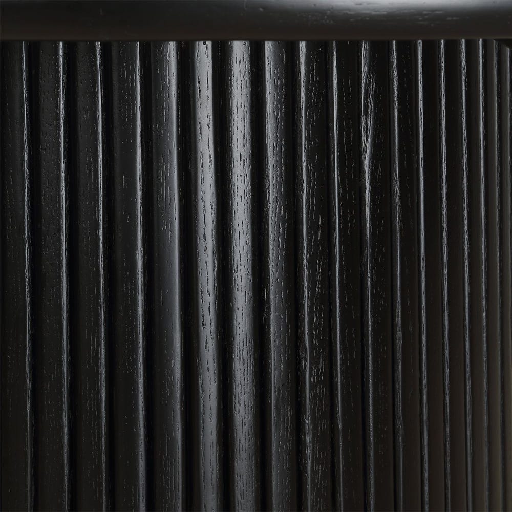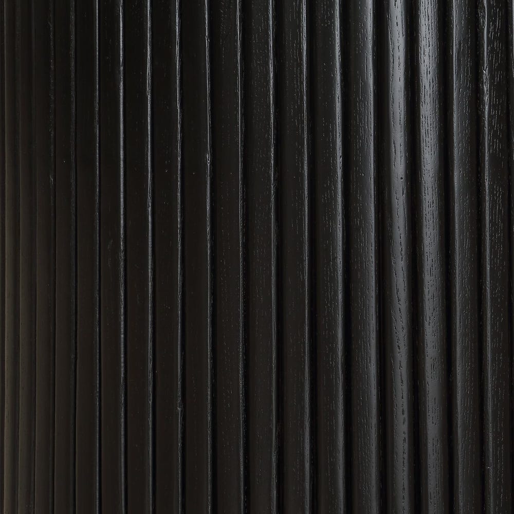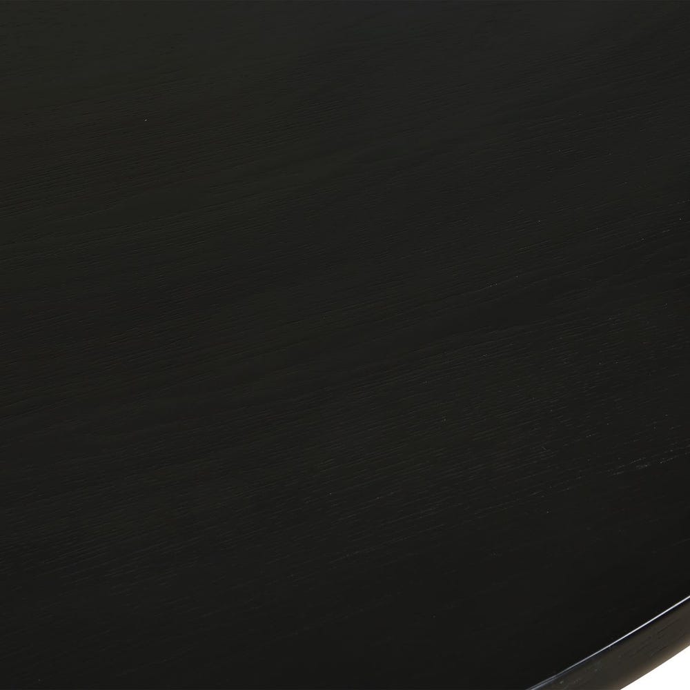 This round dining table is crafted from primarily solid oak wood and finished in a rich black hue, offering a perfect blend of contemporary style and natural durability. The thick, fluted base leg adds a bold, architectural touch, enhancing the table's elegant design.
