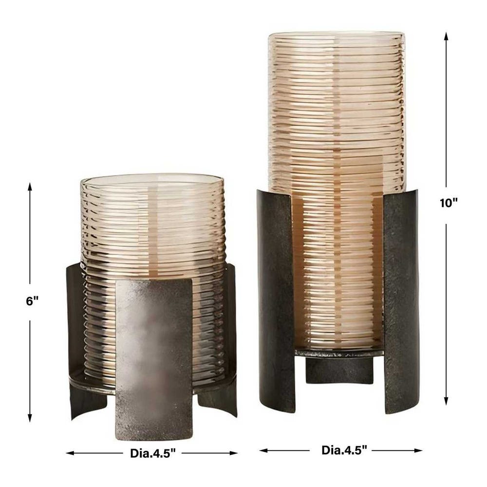 This elegant pair of candleholders feature removable ribbed glass cylinders that sit within a striking dark bronze cast iron stand. Two, 3x3 white candles included.