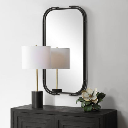 This contemporary design features a unique "frame within a frame" concept. The soft, rounded metal corners add a touch of warmth, while the matte black finish adds interest to this versatile design. May be hung either vertically or horizontally.