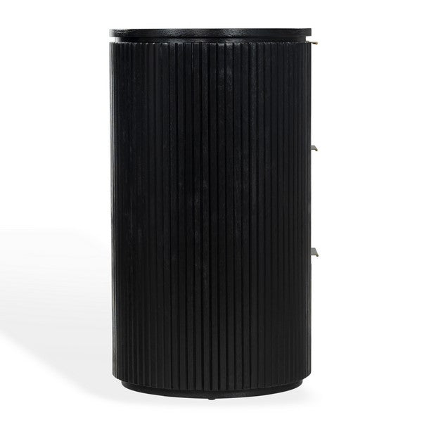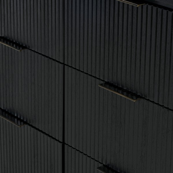 Introducing the stylish Roncaro fluted 6 drawer wood dresser in black, a stunning addition to any bedroom. Crafted from solid wood and complemented by sleek metal accents, this dresser offers both functionality and elegance. Its deep black finish brings a touch of sophistication, making it a versatile piece suitable for any decor theme. Designed with a fluted detail, each of the six spacious drawers provides ample storage for clothing, accessories, and more.